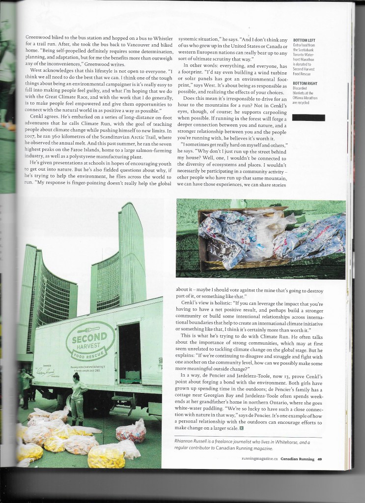 The article (not yet on Canadian Running’s website, but shown below) highlights the ways that a number of runners engage climate change on a range of levels. One highlight from the story: