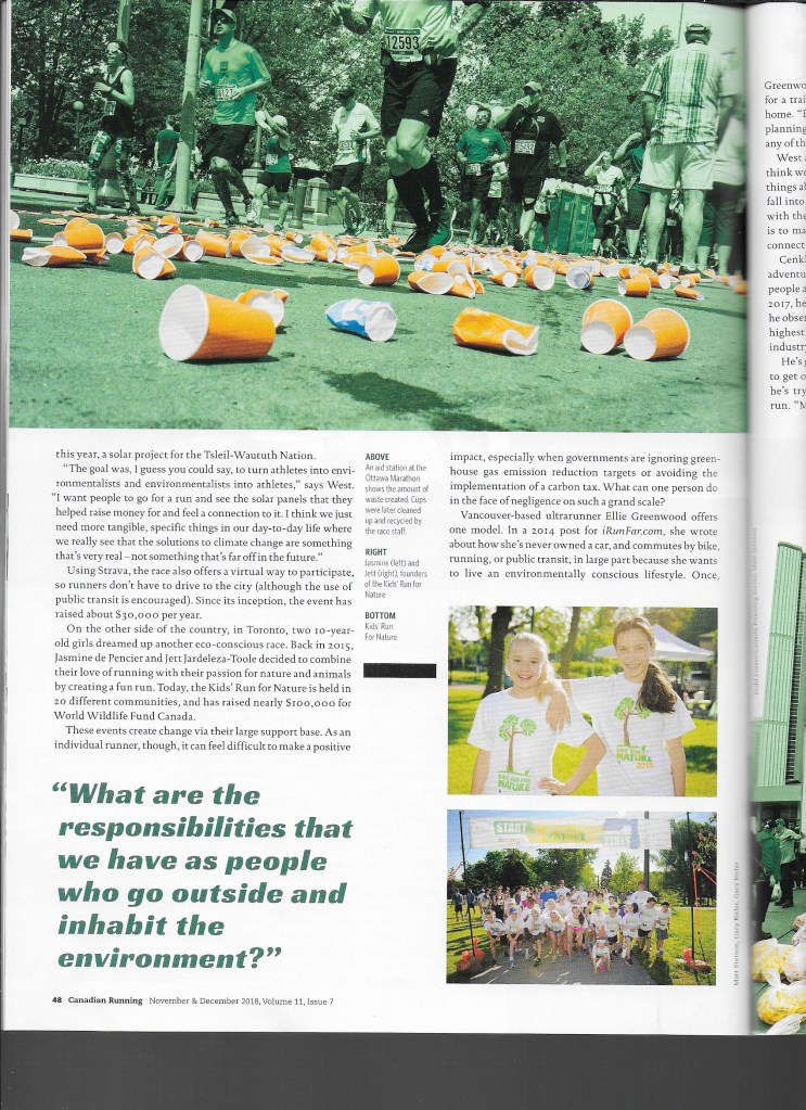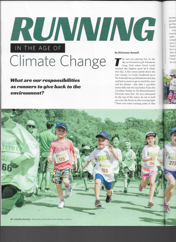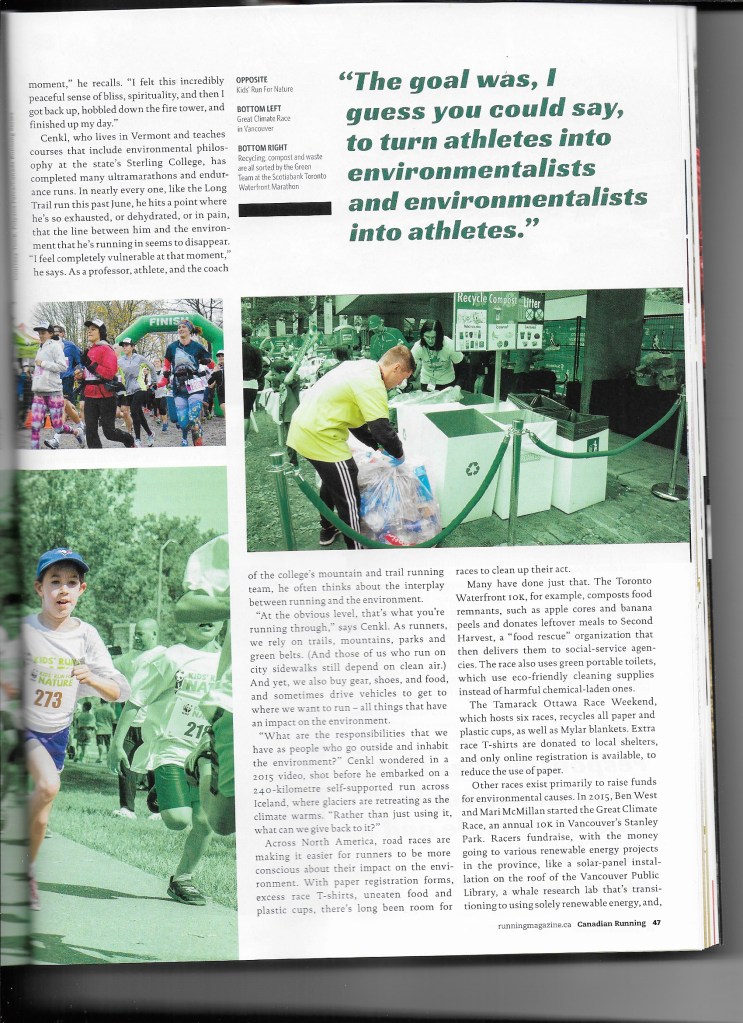 The article (not yet on Canadian Running’s website, but shown below) highlights the ways that a number of runners engage climate change on a range of levels. One highlight from the story: